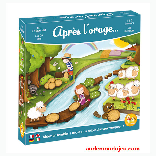 Jeu de société coopératif à partir de 6 ans, pour jouer en famille et entre amis.Après l'orage... le petit pont de bois est détruit, un mouton est séparé de son troupeau, un loup veut l'attraper et un castor répare son barrage.