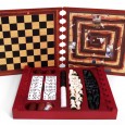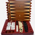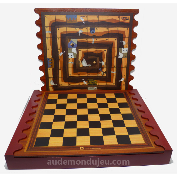 Ce coffret possède 2 plateaux en Padouk (bois rouge aux nervures assez prononcées du plus bel effet) permettant de jouer au backgammon, au Parchis (équivalent espagnol de nos petits chevaux, aux échecs, au jeu de l'oie.