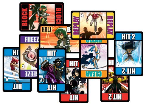 Les cartes Hit : qui peuvent être de trois couleurs différentes (rouges, bleues et vertes). Il s'agit des cartes qui permettent de gagner une base. Une fois le jeu terminé, le joueur ayant le plus de Hit gagne la base.