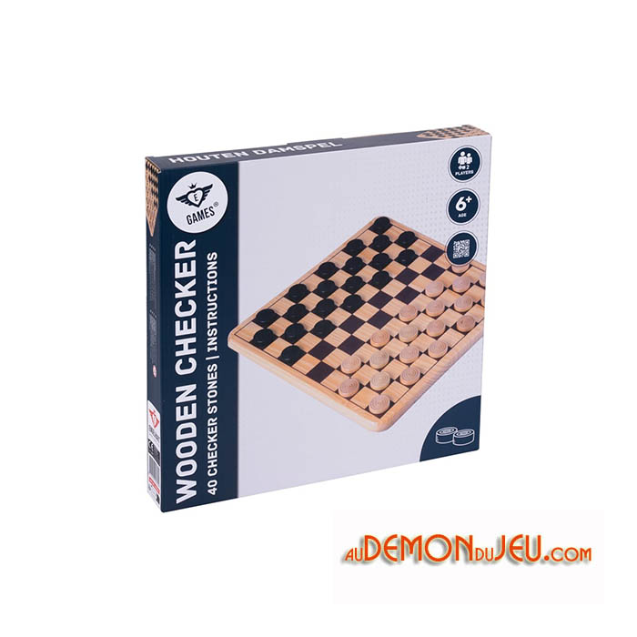 Un jeu de dames en bois de bouleau fourni dans une boîte de couleur.