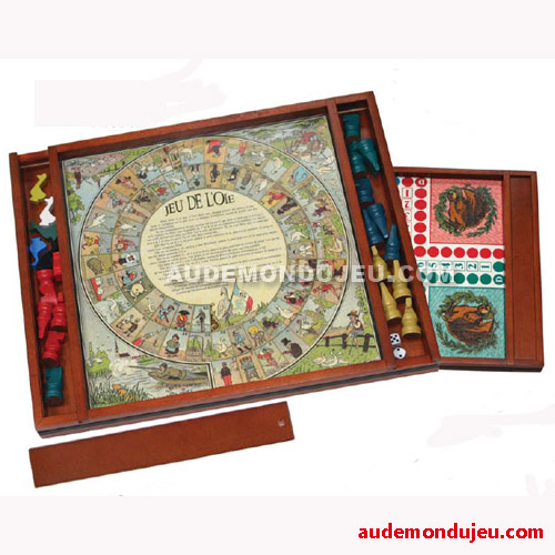 Fourni avec 4 oies en buis, 16 dadas, 2 dés. Dimensions : 41 x 32 cm.