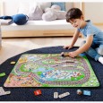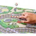 Un plateau de jeu XXL avec voie ferrée, aiguillages et arrêts avec train multicolore en bois