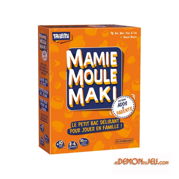 Mamie Moule Maki version Ados & Parents est un jeu simple, accessible, et idéal pour animer une soirée en famille. Il favorise l'échange, la créativité, et l'humour, sans jamais devenir trop complexe.