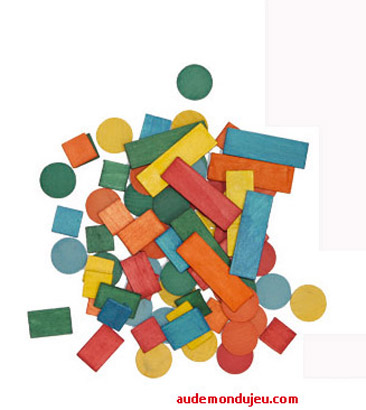 Sachet de 80 pions en bois de différentes formes et de couleurs.