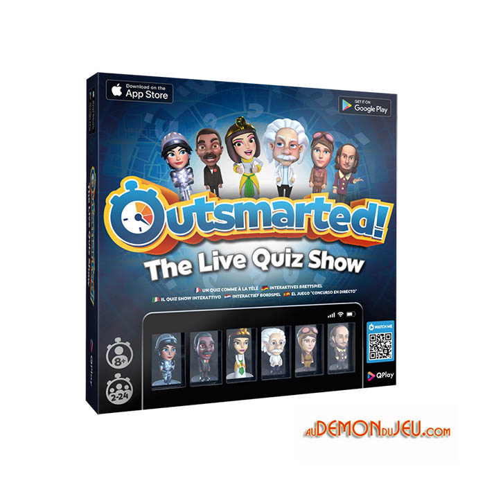 Outsmarted!, le jeu de société sous forme de quiz comme à la télé qui se connecte à votre téléphone, tablette ou ordinateur portable pour vous offrir une expérience interactive, immersive et inoubliable avec toute la famille !