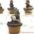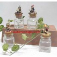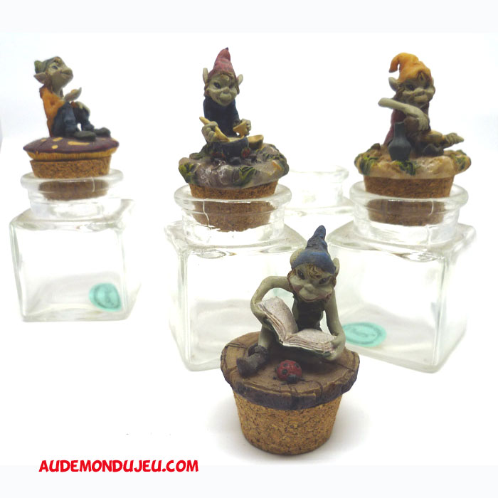 Set de 4 superbes petits flacons en verre décorés par de malicieux lutins juchés sur les bouchons.
